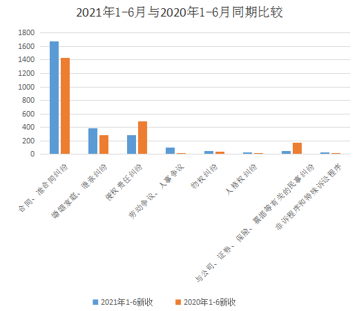 与此同时,物业服务合同纠纷案件增长迅速,2021年上半年新收物业服务合同纠纷案件209件,同比增长129.67%。随着人民群众法律意识的提高,物业服务合同纠纷案件逐渐成为合同类案件中的主力,商品房开发涉及城市整体规划,受影响因素较多,且开发商和业主、业主和物业服务公司之间的纠纷涉及业主切身利益,矛盾不断升级,导致大量案件涌入法院。